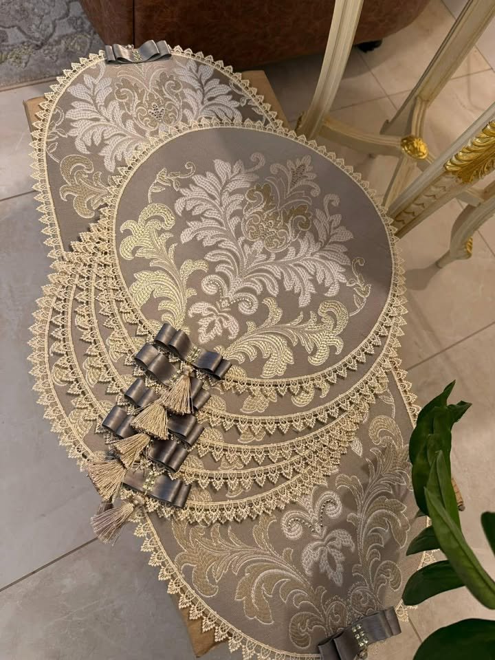 Elegantiškas stalo dekoravimo rinkinys su pilkšvu pagrindu ir smėliniais raštais, papildytas subtiliu dekoru – jauki ir stilinga detalė jūsų namams.