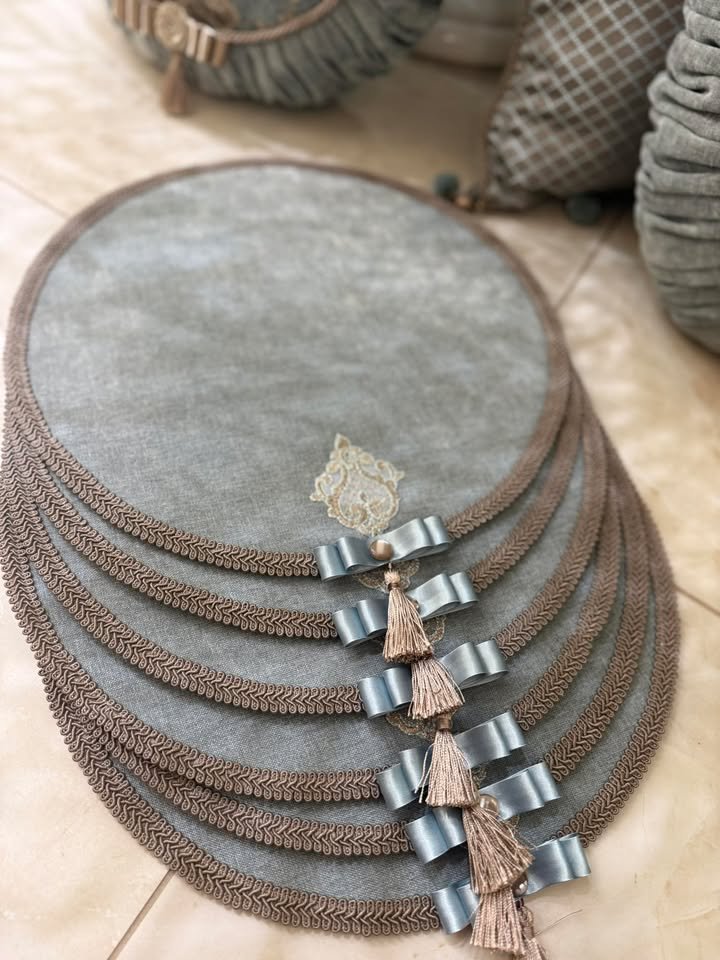 Žydros spalvos stalo padėkliukas su dekoru, papuoštas mini kaspinėlio aplikacija ir dekoratyviniu kuteliu – subtili ir elegantiška stalo dekoravimo detalė.