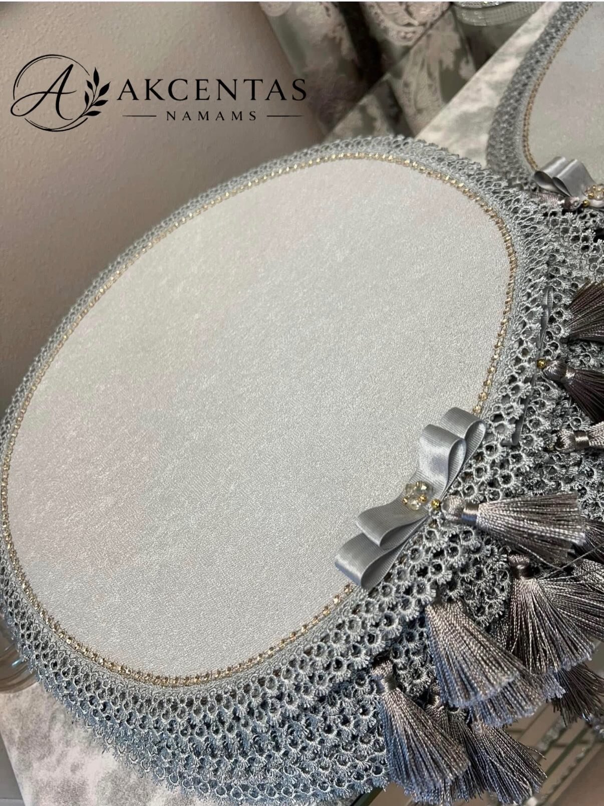 - Pilkas stalo padėkliukas su kaspinėliu ir auksinėmis akutėmis, elegantiška ir subtili stalo dekoravimo detalė.Produkto informacija: