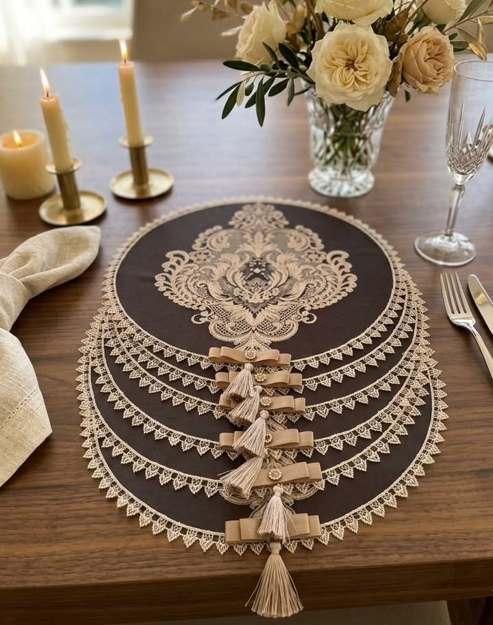 Klasikinis raštuotas audinys, dekoratyvinis kaspinėlis ir subtilūs kuteliai suteikia išskirtinumo bei prabangos pojūtį. Tai ne tik praktiškas stalo dekoro elementas, bet ir stilinga detalė, kuri pabrėžia estetišką serviravimą.