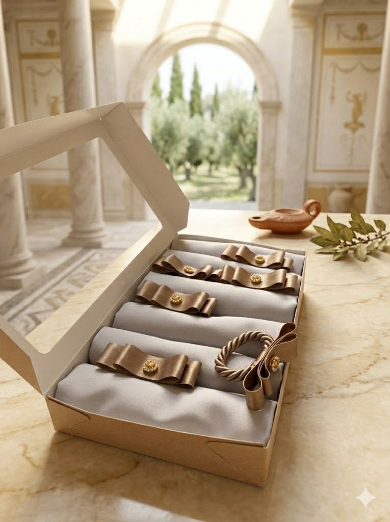 Subtilios prabangos akcentas Jūsų stalo serviravimui. Rankų darbo servetėlių žiedeliai pasižymi švelniu, šiltu atspalviu ir elegantišku dizainu. Dekoruoti kruopščiai formuotu kaspinėliu bei subtilia auksine detale, jie suteikia stalui išbaigtumo ir rafinuotumo.