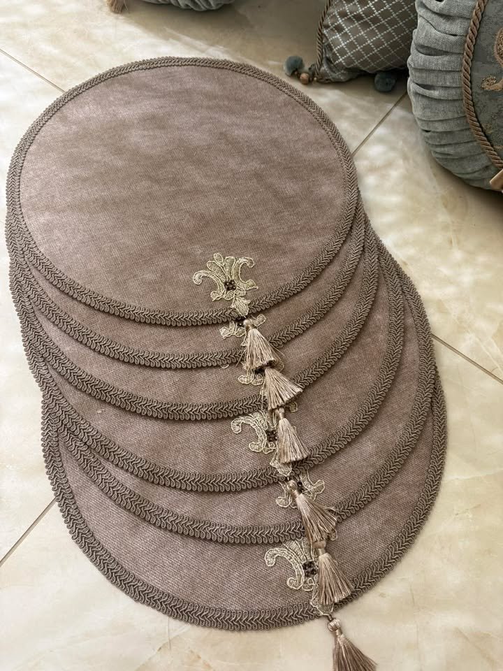 Ruda stalo polėkštė su dekoru, elegantiška ir stilinga stalo dekoravimo detalė.