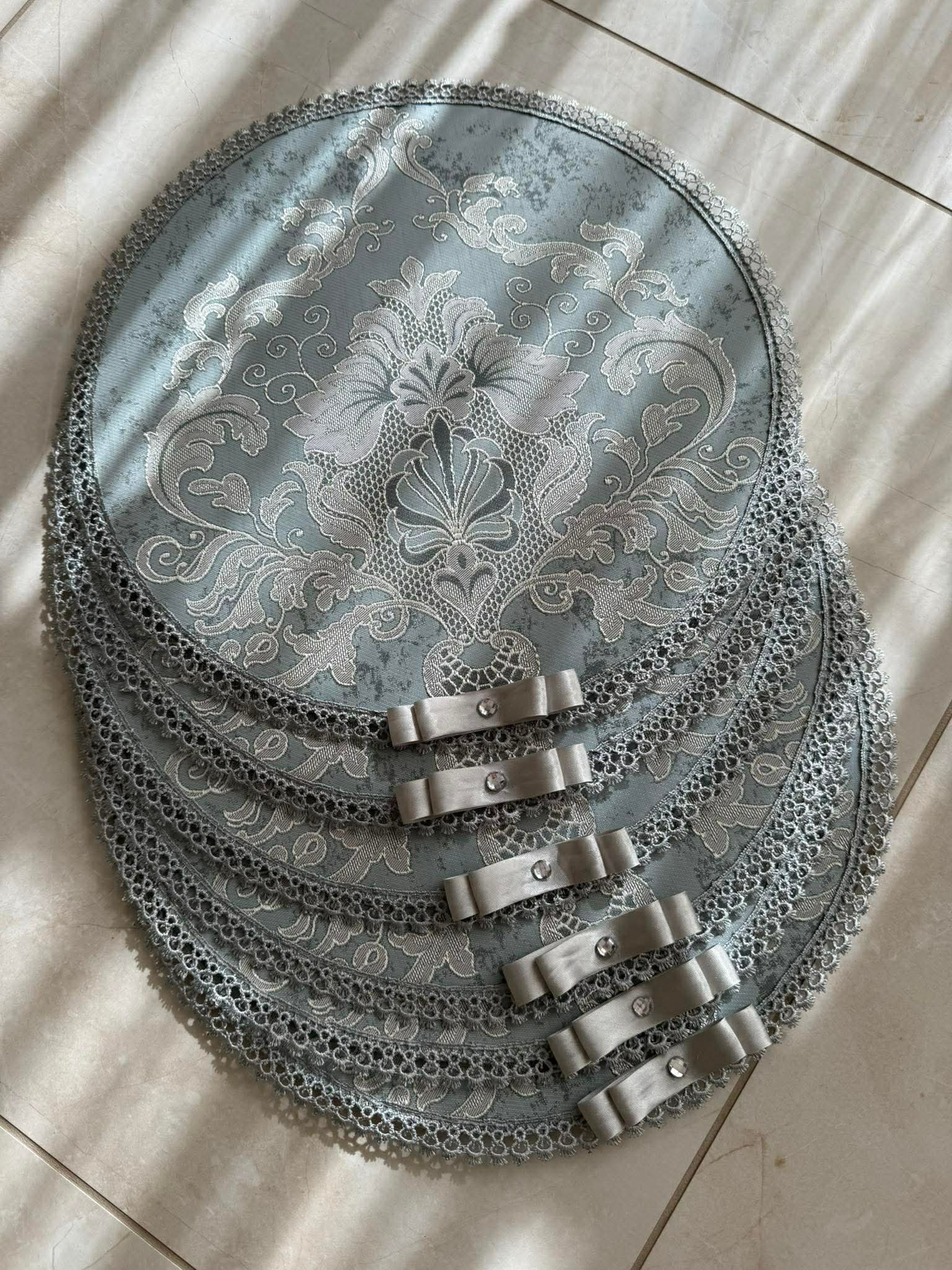 Elegantiški ir subtilūs stalo padėkliukai. Klasikinis raštas suteikia išskirtinumo, o švelnus nėriniuotas apkantavimas – lengvos prabangos pojūtį be papildomų dekoratyvių detalių.