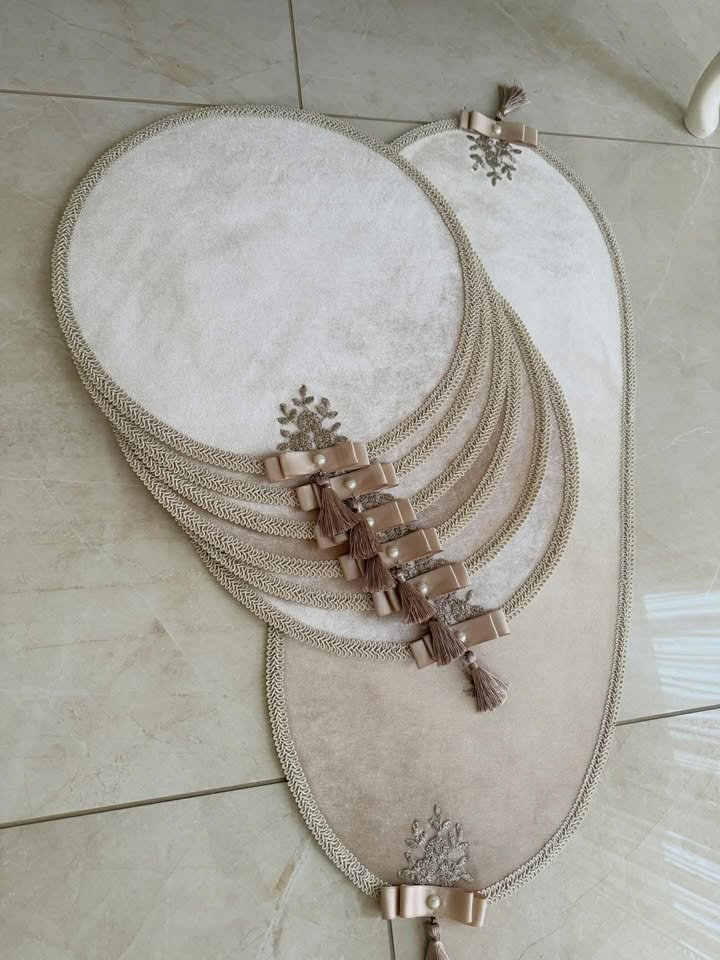 Šviesiai smėlinio veliūro stalo dekoravimo rinkinys su subtiliu dekoru – elegantiška ir jauki detalė jūsų namams.